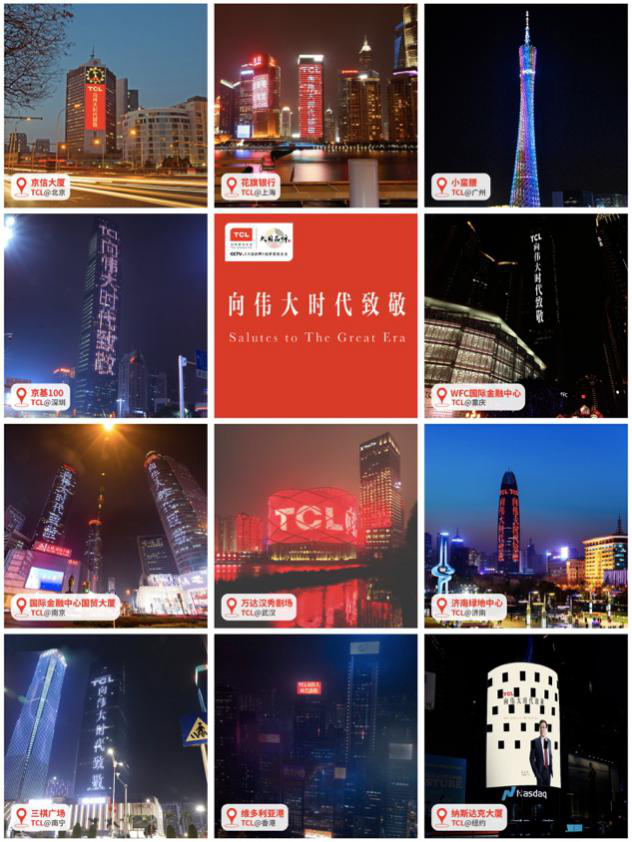 TCL在国内外11个城市地标性建筑大屏同步点亮“TCL向伟大时代致敬”号召画面